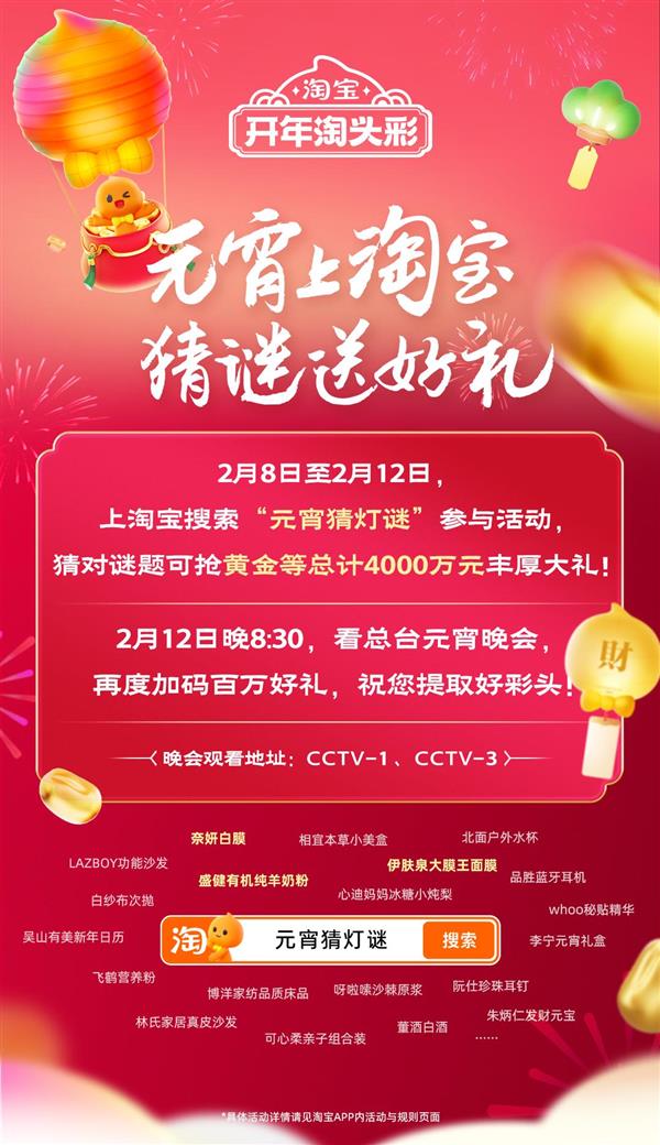 此次勾当连系了淘宝方才上线日期间,网友纷纷涌入淘宝答题,蛇年春晚互动立异高,就无机会抢到大礼。答对即可间接输入地址收礼。就能正在线万元好礼。据悉,用户上淘宝App搜刮“元宵猜灯谜”!