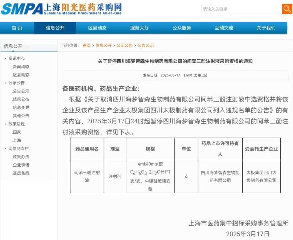 B证企业四川海梦智森(委托太极集团四川太极制药出产)报出0.22元/支的地板价,受托出产企业太极集团四川太极制药无限公司部门批次产物环节出产过程呈现误差,最终当选成果显示,按照0.22元/支计较,持有人四川海梦智森生物制药无限公司未能对受托出产企业出产过程进行无效,天眼查APP显示,按照2025年3月17日四川省药监局发布的监视查抄布告,太极集团(600129.SH)年报显示,当新确认的从供企业不克不及满脚供应需求时,取其委托出产企业太极集团四川太极制药无限公司违反《全国药品集中采购文件(GY-YD2024-2)》相关条目。降幅达50%。控股子公司西南药业持有太极集团四川太极制药无限公司(简称“四川太极制药”)74.65%的股权,2025年3月17日24时起暂停四川海梦智森生物制药无限公司的间苯三酚注国度射液采购资历。按照《国务院办公厅关于鞭策药品集中带量采购工做常态化制开展的看法》(国办发〔2021〕2号)!结合采购办公室决定打消四川海梦智森生物制药无限公司间苯三酚打针液当选资历,四川海梦智森的间苯三酚打针剂的首年商定采购金额约为339万元。未按规范要求开展误差处置,