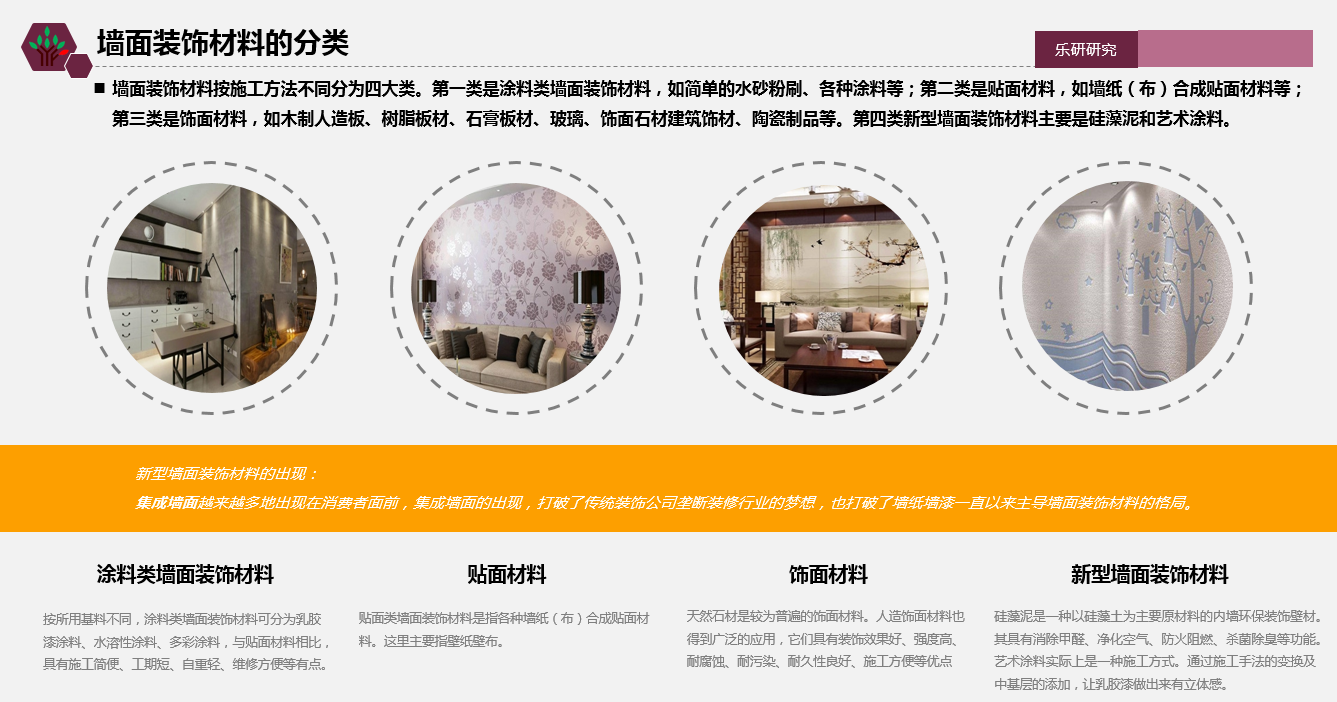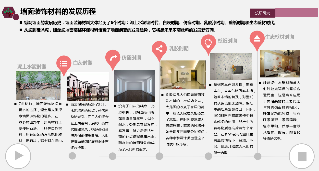 乐研研究发布的《墙面粉饰材料市场现状及将来趋向预测研究演讲》中提到,墙面粉饰材料大体履历了6个期间:土壤水泥墙时代、白灰期间、仿瓷期间、乳胶漆期间、壁纸期间和生态壁材时代。